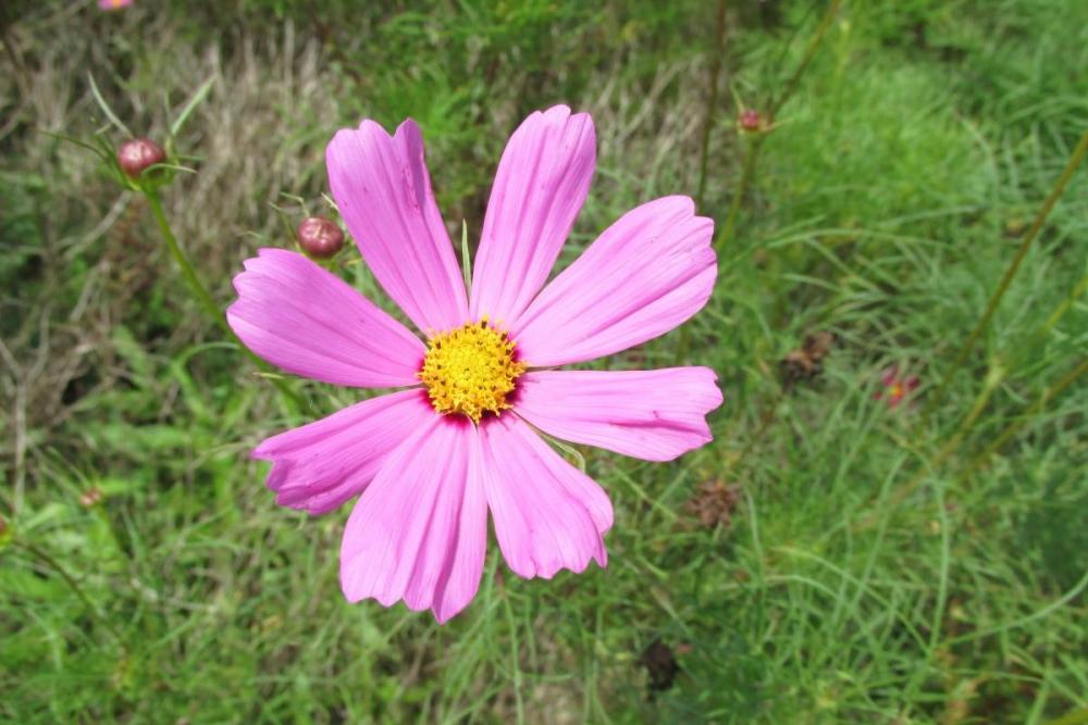 02金剛倎子 少々寂しい背景ですがキレイなコスモスとツボミがアクセントになっています フォトショップメイ 花倶楽部